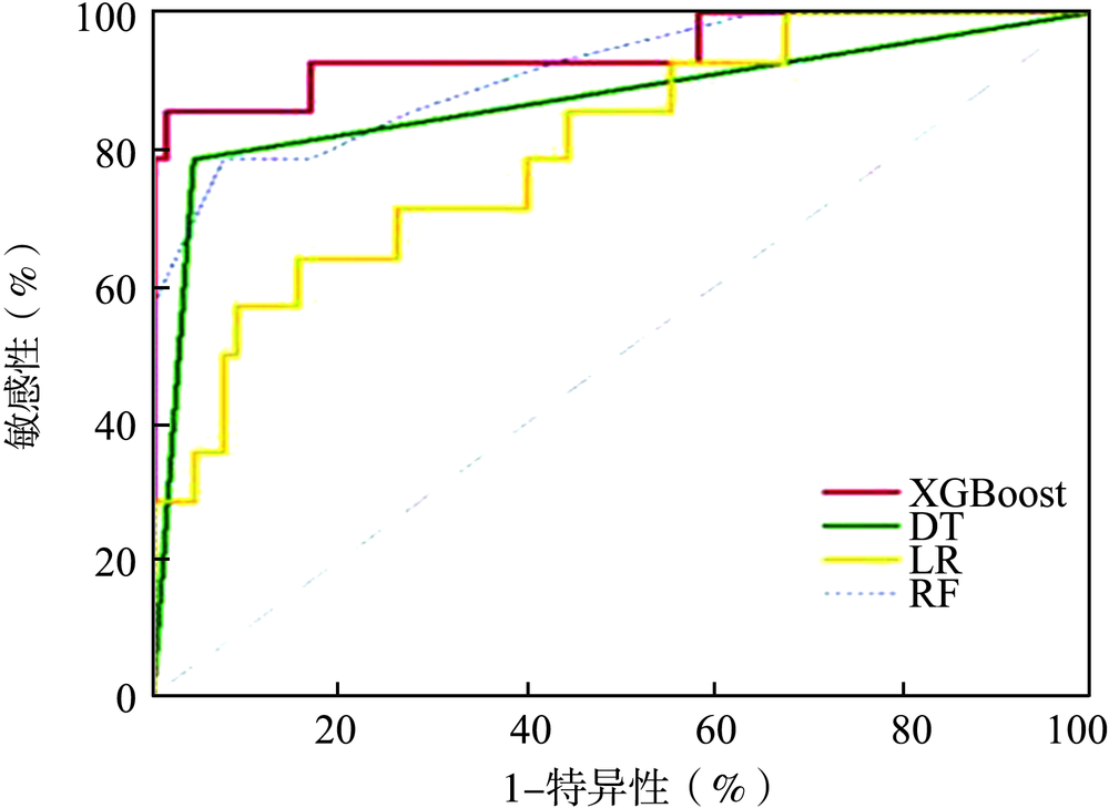 目的 探讨基于磁共振高分辨T2WI影像组学方法对预测直肠癌新辅助治疗后病理完全反应(pCR)的价值。方法 回顾性分析我院2018年1月至2019年3月新辅助治疗前接受磁共振高分辨T2WI成像检查并经病理证实的80例直肠癌患者,在高分辨T2WI图像上手动勾画病灶容积感兴趣区(VOI)后提取影像组学特征,采用最小绝对值收缩算子(LASSO)算法进行降维,筛选对肿瘤pCR有价值的特征,利用Random算法将数据随机分为训练集(n=64)与测试集(n=16)进行机器学习,建立决策树(DT)、逻辑回归(LR)、随机森林(RF)、极限梯度增强树(XGBoost)4种机器学习模型并绘制ROC曲线,分别计算AUC、敏感性、特异性及95%CI,采用DeLong检验比较ROC曲线差异。结果 80例直肠癌患者pCR 15例,占18.75%;非pCR 65例,占81.25%。共提取1 409个影像组学特征,经LASSO算法降维后筛选出8个最有价值的特征。测试集DT、LR、RF、XGBoost 4种分类器模型的AUC分别为0.870、0.801、0.912、0.945,其中XGBoost分类器模型的AUC最大,与DT、LR、RF分类器模型相比较,差异具有统计学意义(P=0.008;P=0.006;P=0.009);其他3种模型两两比较,差异均无统计学意义(PLR-RF=0.083;PDT-LR=0.113;PDT-RF=0.879)。4种分类器模型敏感性分别为78.57%、64.29%、78.57%、85.71%,特异性分别为95.38%、84.62%、92.31%、98.46%,95%CI分别为0.775~0.935、0.696~0.882、0.827~0.964、0.870~0.984。结论 基于高分辨T2WI图像的影像组学对直肠癌新辅助治疗后pCR有预测价值,其中XGBoost模型预测效能优于DT、LR、RF,可以用于辅助临床制定个体化治疗决策。