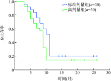 目的 对比不同放疗方案治疗晚期食管鳞状细胞癌的临床疗效、不良反应及预后。方法 回顾性分析2015年1月至2020年1月于江苏省如皋市人民医院接受放疗的60例ⅣB期食管鳞状细胞癌患者的临床资料。根据放疗剂量将患者分为标准剂量组(放疗总剂量<50.4 Gy)和高剂量组(放疗总剂量≥50.4 Gy),每组各30例。采用Wilcoxon符号秩和检验分析患者治疗前后吞咽困难评分,采用χ2检验对比两组患者放疗有效率、吞咽困难缓解率及不良反应发生率。采用Kaplan-Meier法进行生存分析,log-rank检验比较组间生存差异。 结果 标准剂量组和高剂量组患者放疗前及放疗后吞咽困难评分差异均无统计学意义(Z=1.232,P=0.876;Z=1.506,P=0.278)。全组患者放疗后吞咽困难症状得到缓解,吞咽困难评分较放疗前差异有统计学意义(Z=6.347,P<0.001)。标准剂量组和高剂量组患者放疗有效率分别为76.7%(23/30)和83.3%(25/30),差异无统计学意义(χ2=0.417,P=0.519);吞咽困难缓解率分别为80.0%(24/30)和90.0%(27/30),差异无统计学意义(χ2=0.523,P=0.470);不良反应发生率分别为43.3%(13/30)、83.3%(25/30),差异有统计学意义(χ2=10.335,P=0.001)。标准剂量组和高剂量组患者中位总生存期分别为11个月和9个月,差异无统计学意义(χ2=1.490,P=0.256)。 结论 标准剂量组和高剂量组晚期食管鳞状细胞癌患者在近期疗效、症状缓解及远期预后方面无明显差异,但接受标准剂量放疗的患者不良反应发生率低,值得在临床上应用。