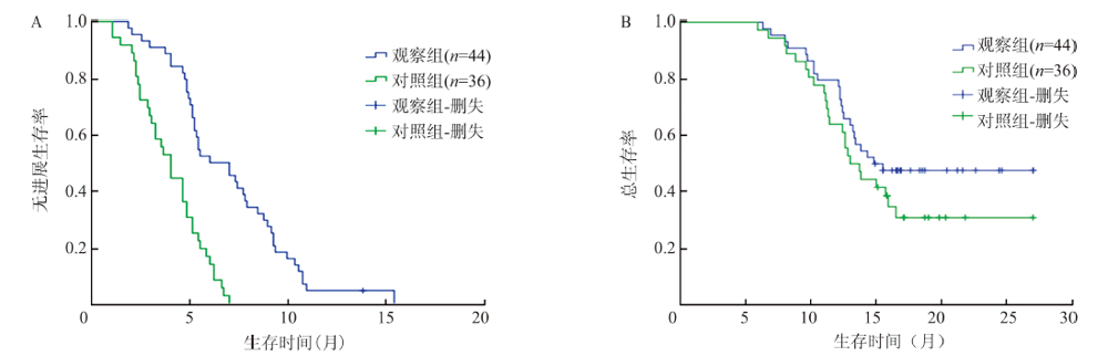 目的 观察安罗替尼联合化疗对二线化疗失败晚期非小细胞肺癌(NSCLC)患者的疗效及安全性。方法 回顾性分析2017年1月至2019年10月安徽医科大学附属巢湖医院肿瘤科收治的80例二线化疗失败的晚期NSCLC患者,根据治疗方案不同,分为对照组(n=36)和观察组(n=44),对照组采用培美曲塞+顺铂治疗,观察组采用培美曲塞+顺铂+安罗替尼治疗。比较两组肿瘤客观缓解率(ORR)、疾病控制率(DCR)、中位无进展生存期(PFS)、总生存期(OS),患者治疗前、后血清血管内皮生长因子(VEGF)、癌胚抗原(CEA)、糖类抗原199(CA199)水平变化以及治疗相关不良反应。结果 治疗2个周期后,对照组和观察组患者ORR分别为5.56%(2/36)、18.18%(8/44),差异无统计学意义(χ2=1.85,P=0.174);对照组、观察组DCR分别为58.33%(21/36)、81.82%(36/44),观察组DCR明显高于对照组,差异具有统计学意义(χ2=5.33,P=0.021)。对照组和观察组患者中位PFS分别为4.0个月、6.0个月,观察组明显长于对照组,差异有统计学意义(χ2=28.47,P<0.001);两组患者中位OS分别为13.0个月、14.8个月,差异无统计学意义(χ2=1.56,P=0.212)。治疗2个周期后两组患者血清VEGF[(21.72±5.42)ng/L vs. (36.97±7.53)ng/L,t=14.13,P<0.001;(16.61±4.14)ng/L vs. (38.85±8.61)ng/L,t=23.09,P<0.001]、CEA[(4.91±1.58)ng/ml vs. (6.62±2.84)ng/ml,t=4.64,P<0.001;(3.07±1.32)ng/ml vs. (7.08±3.31)ng/ml,t=11.50,P<0.001]、CA199[(16.83±5.23)U/ml vs. (20.95±7.94)U/ml;t=3.75,P<0.001;(13.37±5.85)U/ml vs. (21.66±8.72)U/ml,t=7.55,P<0.001]水平均较治疗前明显下降,且治疗后观察组血清VEGF、CEA、CA199水平均明显低于对照组(t=4.78,P<0.001;t=5.68,P<0.001;t=2.76,P=0.007)。观察组血压升高发生率明显高于对照组[25.00%(11/44) vs. 2.78%(1/36),χ2=7.67,P=0.006]。结论 培美曲塞+顺铂+安罗替尼方案用于二线化疗失败的晚期NSCLC患者治疗,可提高DCR、延长患者PFS,改善血清肿瘤相关标志物水平,不良反应可控。