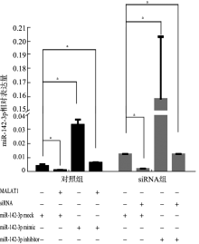 目的 研究肺腺癌转移相关转录本1(MALAT1)靶向调控微小RNA-142-3p(miR-142-3p)导致卵巢癌化疗耐药的机制。方法 收集2016年2月至2019年2月陕西省人民医院80对卵巢癌组织及对应非癌正常组织标本,通过实时荧光定量PCR法检测卵巢癌组织和非癌正常组织中MALAT1及miR-142-3p的相对表达量,并分析二者表达的相关性;通过CCK-8实验验证异常表达的MALAT1及miR-142-3p对卵巢癌Hey细胞增殖和化疗药物5-氟尿嘧啶及顺铂敏感性的影响;通过双荧光素酶报告基因实验(分4组:MALAT1 wt组、MALAT1 wt+miR-142-3p mimic组、MALAT1 mut组和MALAT1 mut+miR-142-3p mimic组)检测miR-142-3p与MALAT1的靶向关系;通过RNA免疫沉淀反应实验验证MALAT1与miR-142-3p的靶点。结果 在卵巢癌组织和对应非癌正常组织中,MALAT1的相对表达量分别为0.000 52(0.002 56)、0.000 47(0.000 89),差异有统计学意义(Z=2.365,P=0.018);miR-142-3p的相对表达量分别为0.001 19(0.002 69)、0.001 61(0.008 48),差异有统计学意义(Z=2.935,P=0.003);二者在卵巢癌组织中的表达呈负相关(r=-0.474,P<0.001)。miR-142-3p在miR-142-3p mock组的相对表达量明显低于MALAT1+miR-142-3p mimic组(0.004 18±0.001 24 vs. 0.006 51±0.000 28;t=3.174,P=0.017)。MALAT1 wt组与MALAT1 wt+miR-142-3p mimic组的相对荧光富集度分别为2.27±0.86、31.10±6.05,差异具有统计学意义(t=8.172,P<0.001)。Hey细胞转染MALAT1过表达质粒48、72、96 h后,MALAT1过表达组和对照组的吸光度(A)值(0.522±0.021 vs. 0.433±0.021;0.644±0.012 vs. 0.544±0.051;0.887±0.055 vs. 0.698±0.042)差异均有统计学意义(均P<0.05)。Hey细胞过表达MALAT1后,5-氟尿嘧啶0.10 ng/μl浓度时,MALAT1过表达组的细胞增殖速度明显较对照组快(0.615±0.036 vs. 0.506±0.042;t=4.432,P=0.002),5-氟尿嘧啶1.00、10.00、100.00 ng/μl浓度时显示出同样的趋势(均P<0.05);顺铂0.01 ng/μl浓度时,MALAT1过表达组的细胞增殖速度明显较对照组快(0.777±0.015 vs. 0.733±0.039;t=2.355,P=0.023),顺铂0.10、1.00、10.00、100.00 ng/μl浓度时显示出同样的趋势(均P<0.05)。Hey细胞过表达miR-142-3p后,5-氟尿嘧啶0.10 ng/μl浓度时,miR-142-3p过表达组的细胞增殖速度明显较对照组细胞慢(0.512±0.051 vs. 0.744±0.119;t=4.028,P=0.004),5-氟尿嘧啶1.00、10.00、100.00 ng/μl浓度时显示出同样的趋势(均P<0.05);顺铂0.10 ng/μl浓度时,miR-142-3p过表达组的细胞增殖速度明显较对照组慢(0.520±0.043 vs. 0.674±0.096;t=3.441,P=0.009),顺铂1.00、10.00、100.00 ng/μl浓度时显示出同样的趋势(均P<0.05)。采用0.10、1.00、10.00、100.00 ng/μl浓度的5-氟尿嘧啶和顺铂分别处理卵巢癌Hey细胞后,MALAT1过表达组、MALAT1+miR-142-3p组与对照组间的细胞增殖差异均具有统计学意义(均P<0.05),进一步两两比较发现,MALAT1+miR-142-3p组均显著慢于MALAT1过表达组(均P<0.05)。结论 MALAT1通过靶向调控miR-142-3p使卵巢癌细胞对5-氟尿嘧啶及顺铂的敏感性降低,导致卵巢癌化疗耐药。