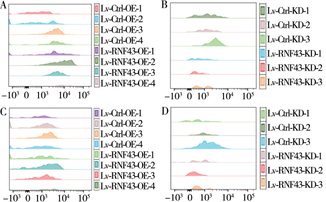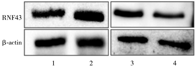 目的 探讨环指蛋白43(RNF43)对黑色素瘤中CD8+ T细胞介导的抗肿瘤免疫反应的调节作用。方法 利用慢病毒感染技术对小鼠黑色素瘤细胞株B16-OVA进行RNF43基因过表达与敲低;通过小鼠皮下成瘤实验检测Lv-Ctrl-OE组、Lv-RNF43-OE组、Lv-Ctrl-KD组和Lv-RNF43-KD组小鼠黑色素瘤细胞株B16-OVA体内增殖情况,通过流式细胞术检测黑色素瘤肿瘤免疫微环境中CD8+ T细胞穿孔素和γ干扰素(IFN-γ)的表达水平;采用实时荧光定量PCR实验检测细胞中β-catenin和程序性死亡受体配体1(PD-L1) mRNA的表达水平;通过双荧光素酶报告基因实验检测RNF43对PD-L1的转录调控作用。结果 本研究成功构建RNF43稳定过表达与敲低的小鼠黑色素瘤细胞株Lv-RNF43-OE和Lv-RNF43-KD。小鼠皮下成瘤实验结果显示,Lv-RNF43-OE组瘤体质量为(0.08±0.06)g,明显小于Lv-Ctrl-OE组的(1.04±0.52)g,差异有统计学意义(t=3.71,P=0.032);Lv-RNF43-KD组瘤体质量为(1.94±0.29)g,与Lv-Ctrl-KD组的(1.15±0.74)g相比差异无统计学意义(t=-1.70,P=0.164)。流式细胞术结果显示,Lv-RNF43-OE组CD8+ T细胞穿孔素荧光强度为9 034±2 628,明显高于Lv-Ctrl-OE组的3 847 ±1 637,差异有统计学意义(t=-3.35,P=0.015);Lv-RNF43-KD组CD8+ T细胞穿孔素荧光强度为966±247,明显低于Lv-Ctrl-KD组的2 226±646,差异有统计学意义(t=3.16,P=0.034);Lv-RNF43-OE组CD8+ T细胞IFN-γ荧光强度为2 422±429,明显高于Lv-Ctrl-OE组的1 688±324,差异有统计学意义(t=-2.73,P=0.034);Lv-RNF43-KD组CD8+T细胞IFN-γ荧光强度为614(454,863),与Lv-Ctrl-KD组的1 159(1 152,2 068)相比差异有统计学意义(Z=-1.96,P=0.050)。实时荧光定量PCR实验结果显示,Lv-RNF43-OE组β-catenin mRNA相对表达量为0.67±0.16,明显低于Lv-Ctrl-OE组的1.00±0.11,差异有统计学意义(t=2.98,P=0.041);Lv-RNF43-OE组PD-L1 mRNA相对表达量为0.32±0.09,明显低于Lv-Ctrl-OE组的1.00±0.09,差异有统计学意义(t=9.13,P=0.001)。双荧光素酶报告基因实验结果显示,pCMV6-NC组、RNF43组、RNF43+β-catenin组和β-catenin组PD-L1启动子荧光素酶活性分别为1.00±0.00、0.84±0.00、1.49±0.00和1.57±0.03(F=2 218.33,P<0.001),进一步两两比较发现,与pCMV6-NC组相比,RNF43组PD-L1启动子荧光素酶活性明显降低(P<0.001),RNF43+β-catenin组和β-catenin组PD-L1启动子荧光素酶活性明显升高(P<0.001;P=0.003);与RNF43组相比,RNF43+β-catenin组PD-L1启动子荧光素酶活性明显升高(P<0.001)。结论 RNF43可能通过抑制β-catenin的表达降低黑色素瘤中PD-L1 mRNA的表达并促进CD8+ T细胞介导的抗肿瘤免疫反应。